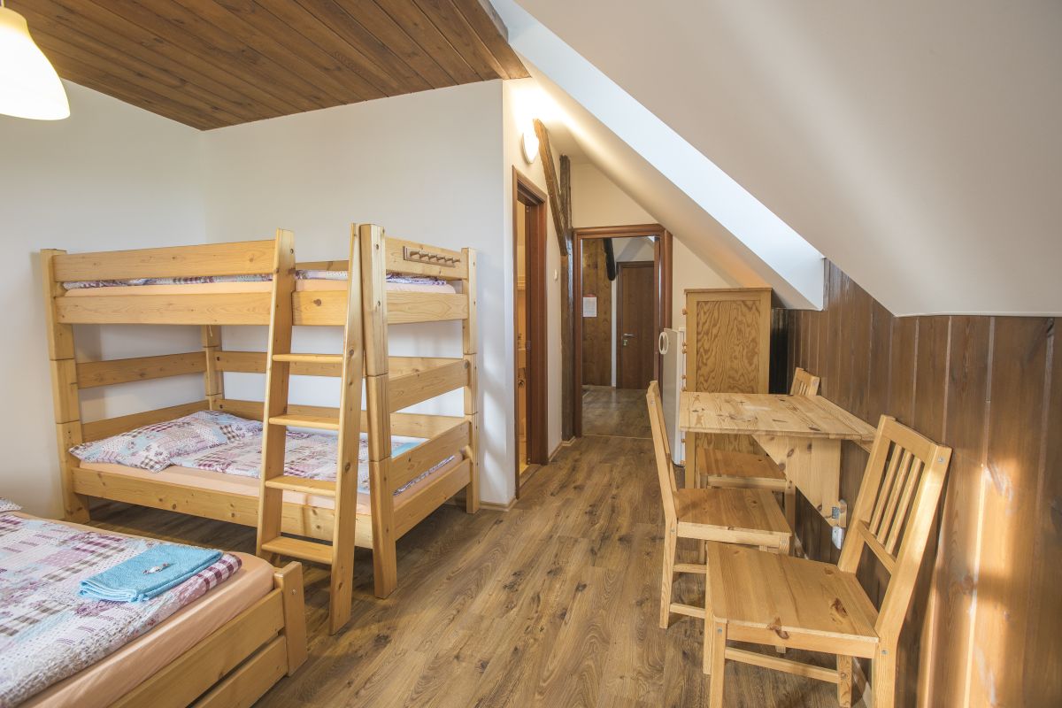 1x manželská postel, 1X patrová postel , stůl, židle, komoda, skříň, lednice WC, SPRCHA, UMYVADLO TV, wi-fi INTERNET - v ceně pokoje